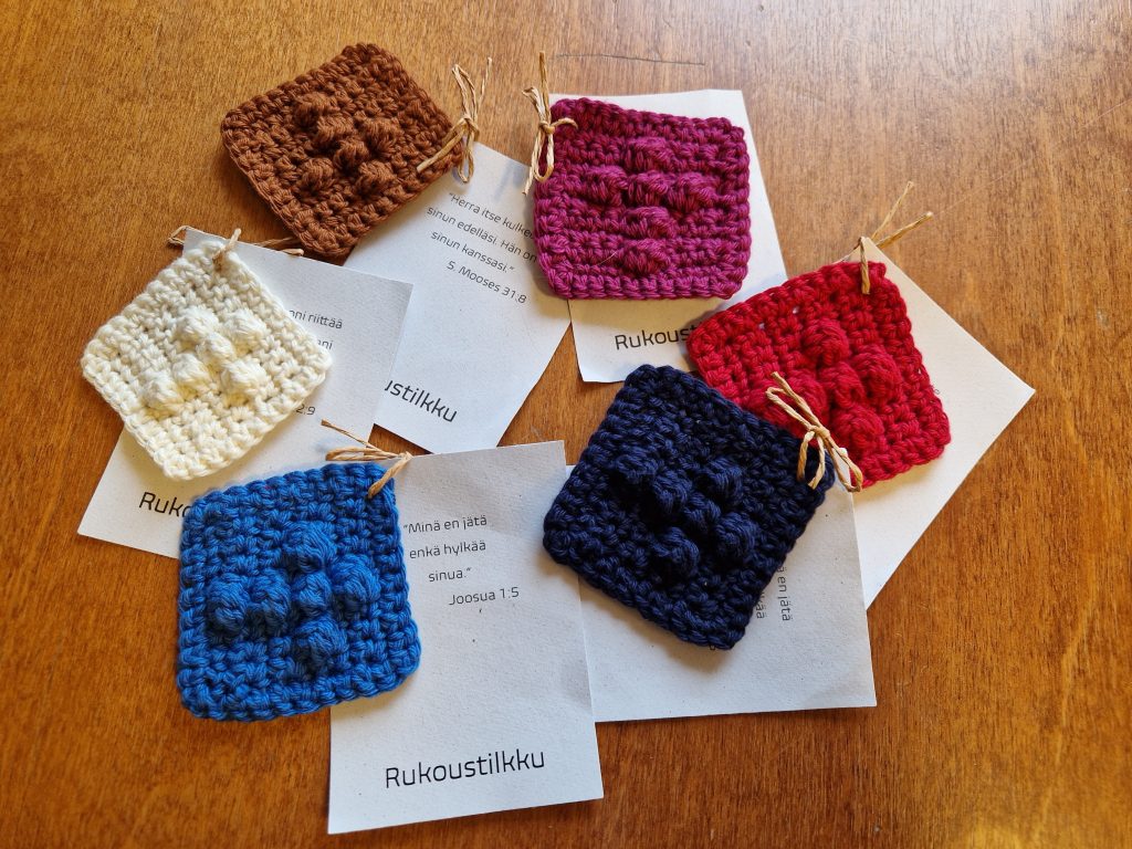 Rukoustilkut on virkattu puuvillalangasta, väreinä sininen, valkoinen, punainen, ruskea, violetti ja tummansininen -tilauksia saa tehdä myös muista väreistä!